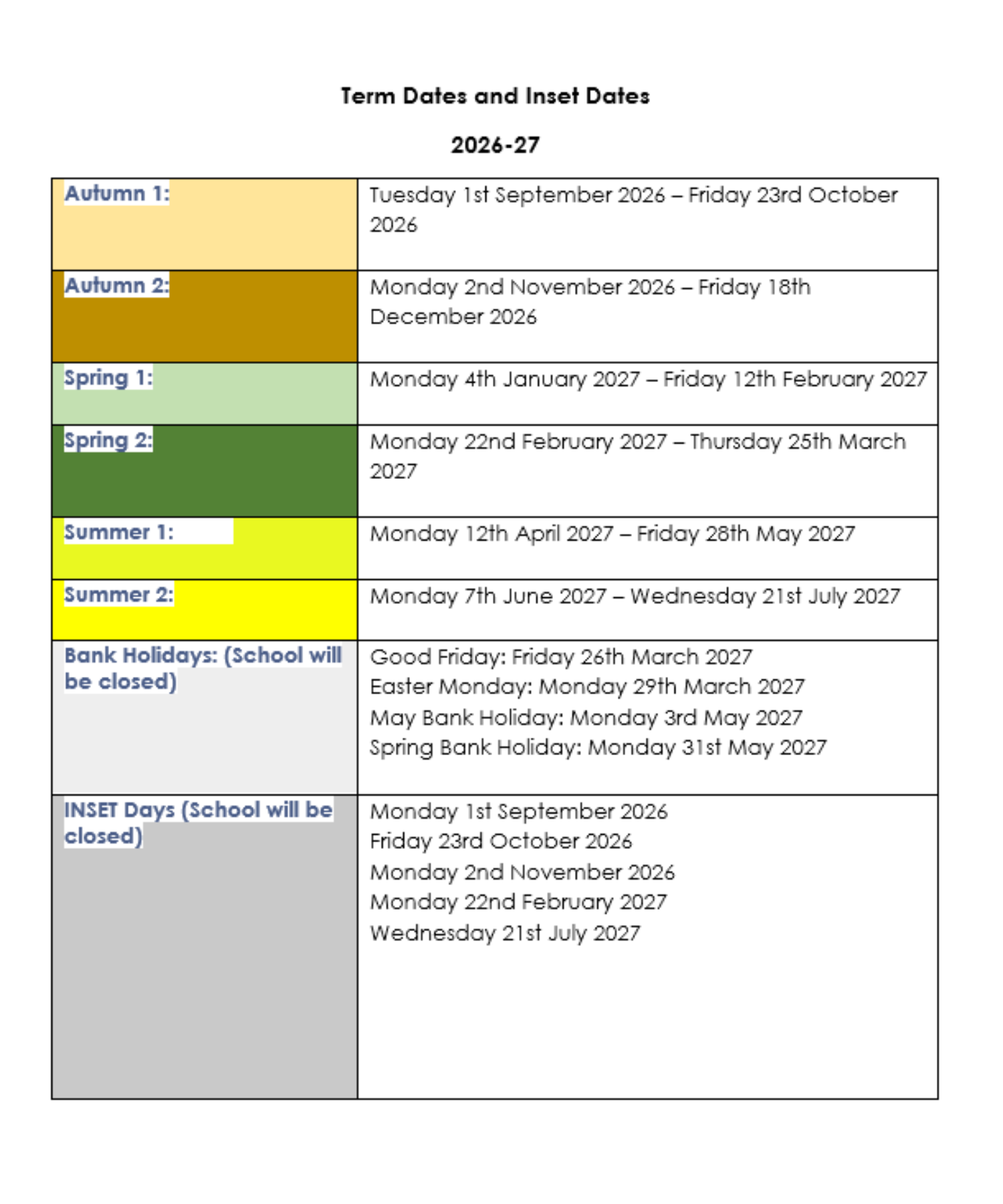 Term dates and Inset Dates 2026-27